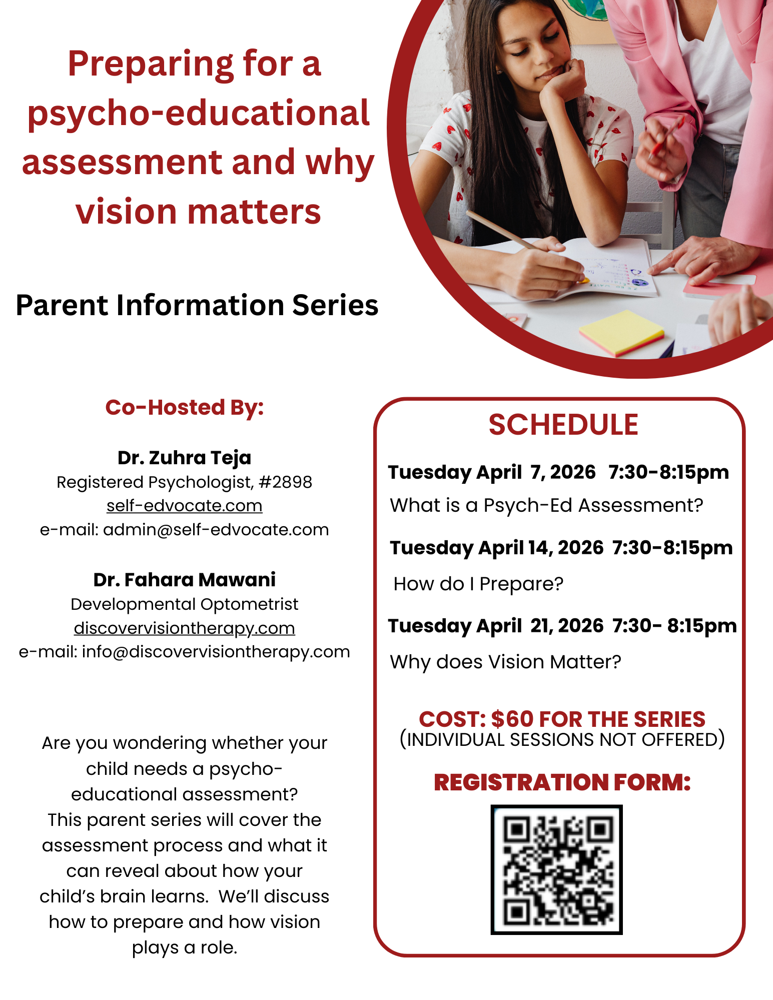 If you’re considering whether an assessment is appropriate, or are already on a waitlist, you may have questions: Who is an appropriate candidate? What does the process involve? What insights might emerge from the assessment, and what are the next steps? If so, I invite you to register for our upcoming virtual parent education series, co-hosted with developmental optometrist Dr. Fahara Mawani of Discover Vision Therapy. Professionals who support families are also welcome to register. Space is limited.